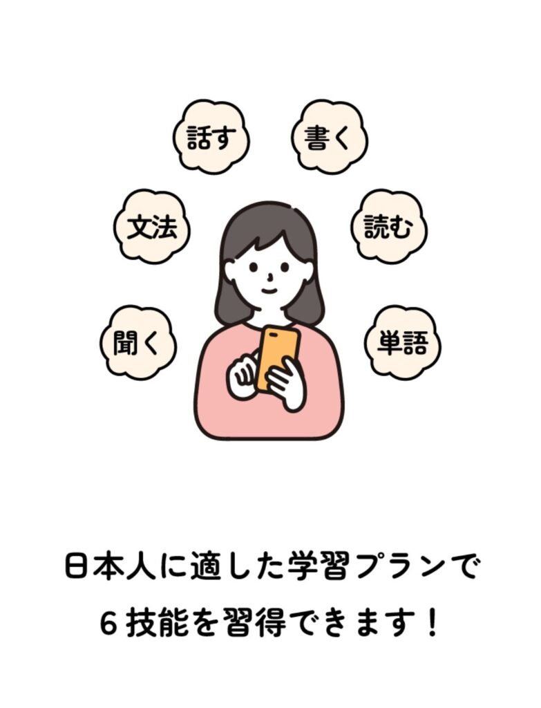 リーディング・リスニング・スピーキング・単語・文法・発音の6技能をバランスよく伸ばせる、日本人に最適化された英語学習アプリです。