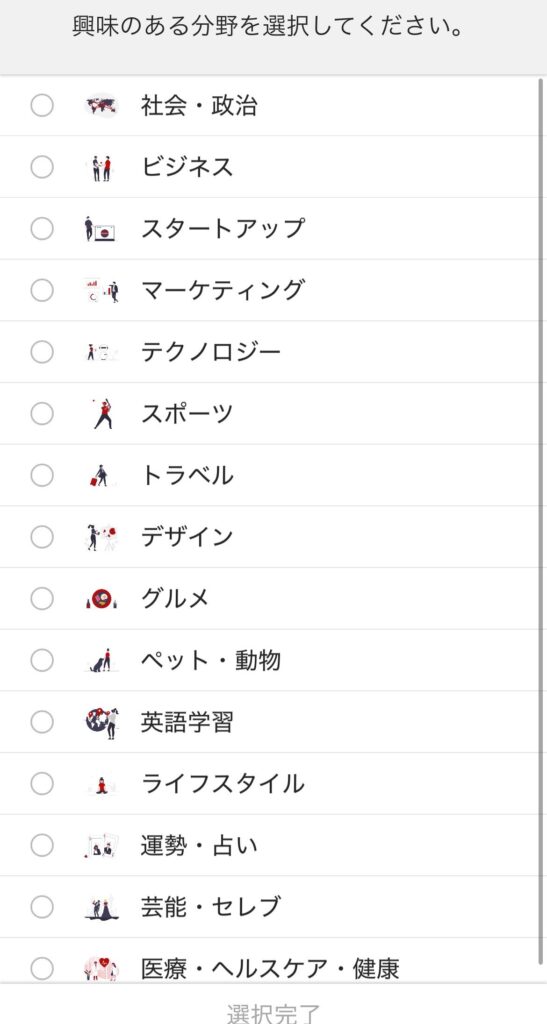 興味のある分野は、IT・テクノロジー、デザイン、ライフスタイル、芸能、ペット、トラベルなど幅広く選択可能。