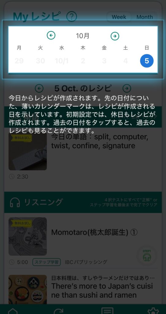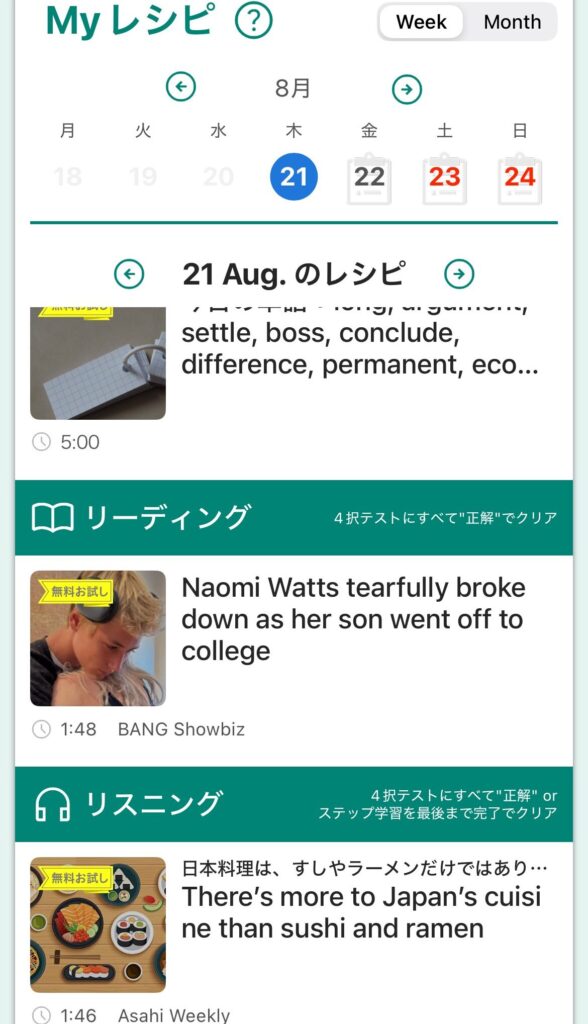 この設定により、自分の関心に沿ったニュース記事や学習素材がMyレシピに組み込まれるため、「読むのが楽しい」「続けやすい」と感じやすくなります。単に勉強するだけでなく、興味あるニュースを通じて英語力を伸ばせるのがこのアプリの特徴です。