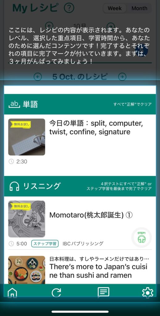 次に、簡単なレベルテストを受けて、自分に合った学習プラン「Myレシピ」を作成します。作成はアプリ画面右下の歯車マークから可能で、以下の設定を反映できます。